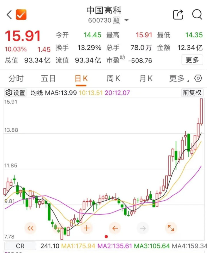 值得一提的是,中国高科12日当天股价开盘后快速涨停,全天成交额12.34亿元,换手率13.29%。公司目前的总市值也处于五年来的高位,最新市值为93.34亿元。